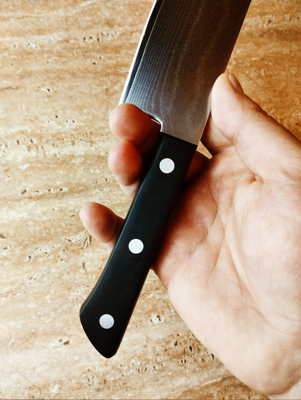 "drei Tugenden". Dieser Name bezieht sich auf die drei Hauptfunktionen des Messers: Schneiden, Würfeln und Hacken.