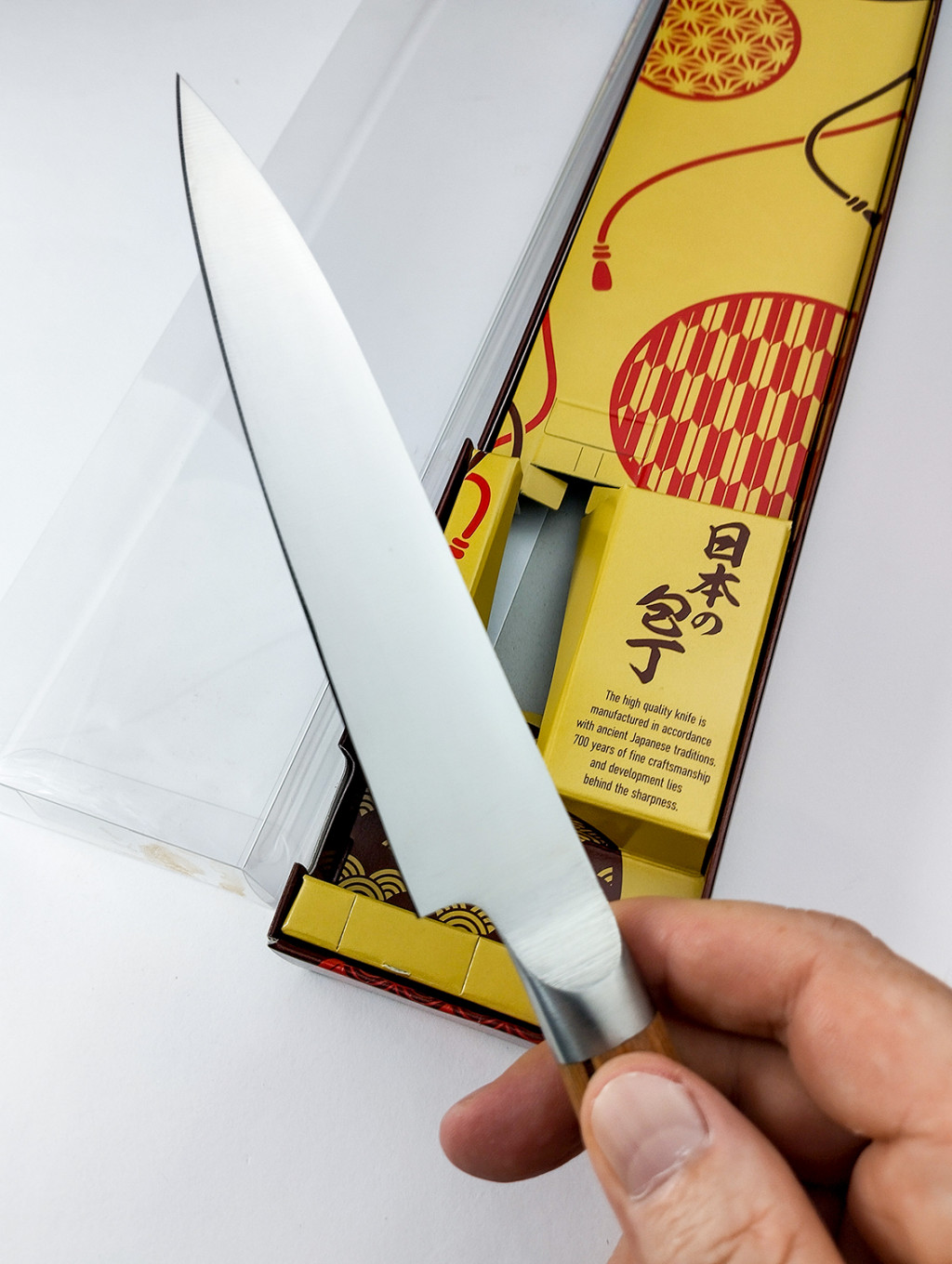 Das Herzstück des Messers ist die Klinge aus AUS-8A Edelstahl, die eine hervorragende Schnitthaltigkeit und Korrosionsbeständigkeit bietet, während sie gleichzeitig leicht zu schärfen und zu pflegen ist. Dieser japanische Qualitätsstahl ist ein Garant für langfristige Zuverlässigkeit im täglichen Küchengebrauch. Ergänzend zur Klinge ist der Griff aus hochwertigem Pakkaholz gefertigt. Der Pakkaholzgriff verleiht dem Messer nicht nur ein elegantes und modernes Aussehen, sondern bietet auch einen ausgezeichneten, rutschfesten Halt, liegt angenehm in der Hand und ist extrem langlebig.