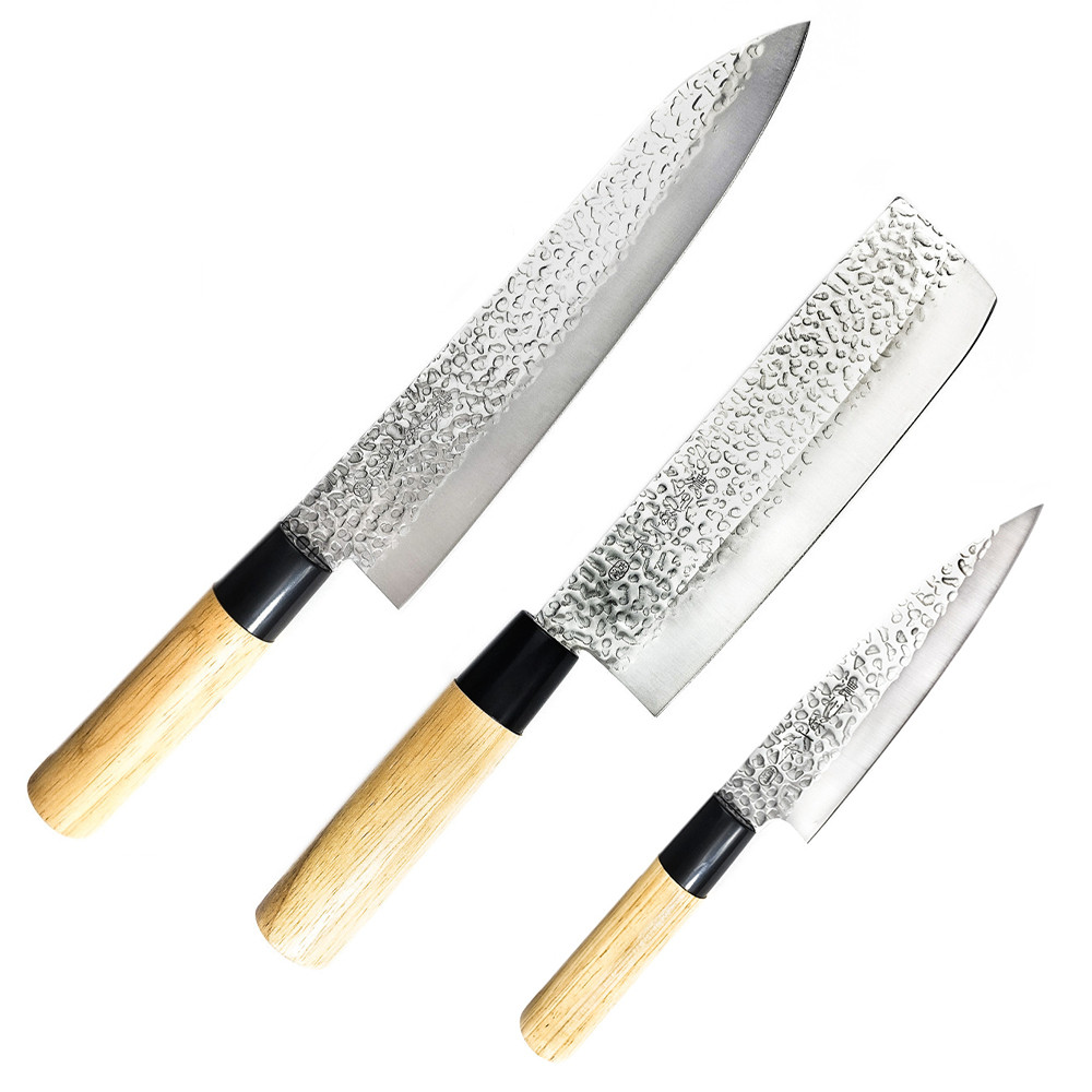 Acest set de trei cuțite de bucătărie japoneze clasice Satake Megumi Tsuchime formează un set complet de cuțite pentru sarcinile de zi cu zi din bucătărie:
