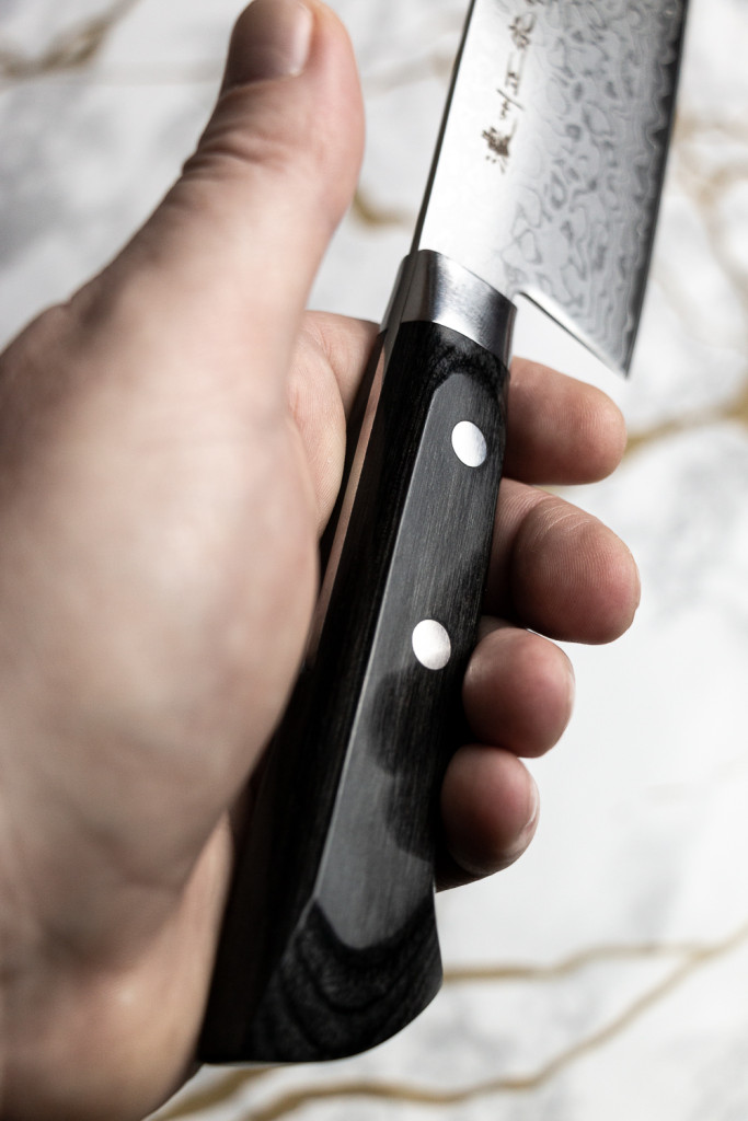 The santoku (三徳) knife, whose name means "three virtues," originated in Japan during the Showa era (1926-1989) as a response to changing eating habits. Its direct predecessor was the bunka knife, inspired by the gyuto and nakiri knives. The name "santoku" refers to the knife's three main areas of use: slicing (thinly cutting meat, fish, and vegetables), dicing (the blade's straight edge allows for precise dicing), and chopping (the blade's shape and weight facilitate chopping vegetables and herbs). For this reason, it is often called the "three virtues knife." The popularity of the santoku knife spread worldwide at the end of the 20th century, and today it is considered one of the basic types of kitchen knives. The Satake Unique Sai Damascus santoku knife is the perfect harmony of traditional Japanese elegance and modern kitchen functionality.