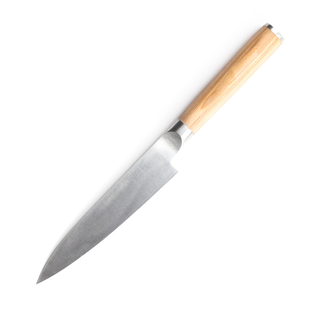 The heart of the knife is the AUS-8A stainless steel blade, which provides outstanding edge retention and corrosion resistance, while being easy to sharpen and maintain. This Japanese quality steel guarantees long-term reliability during everyday kitchen use. Complementing the blade, the handle is crafted from premium pakkawood. The pakkawood handle not only lends an elegant and modern appearance to the knife but also provides an excellent, non-slip grip, is comfortable in the hand, and is extremely durable.