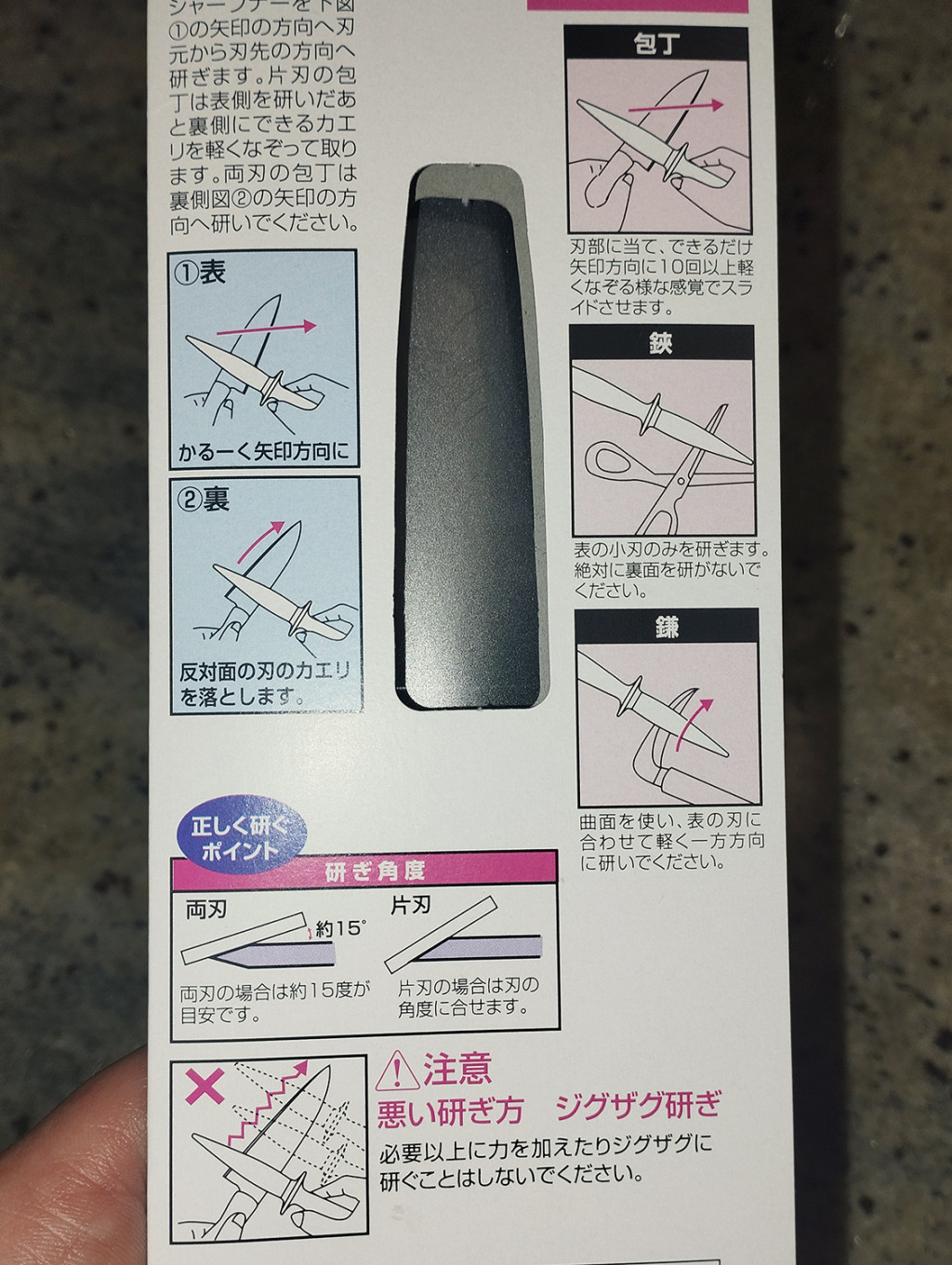 - Hold the knife steadily! Place the sharpener on the edge of the blade and slide it gently and lightly toward the tip of the blade, following the direction of the arrows. Do not press hard!